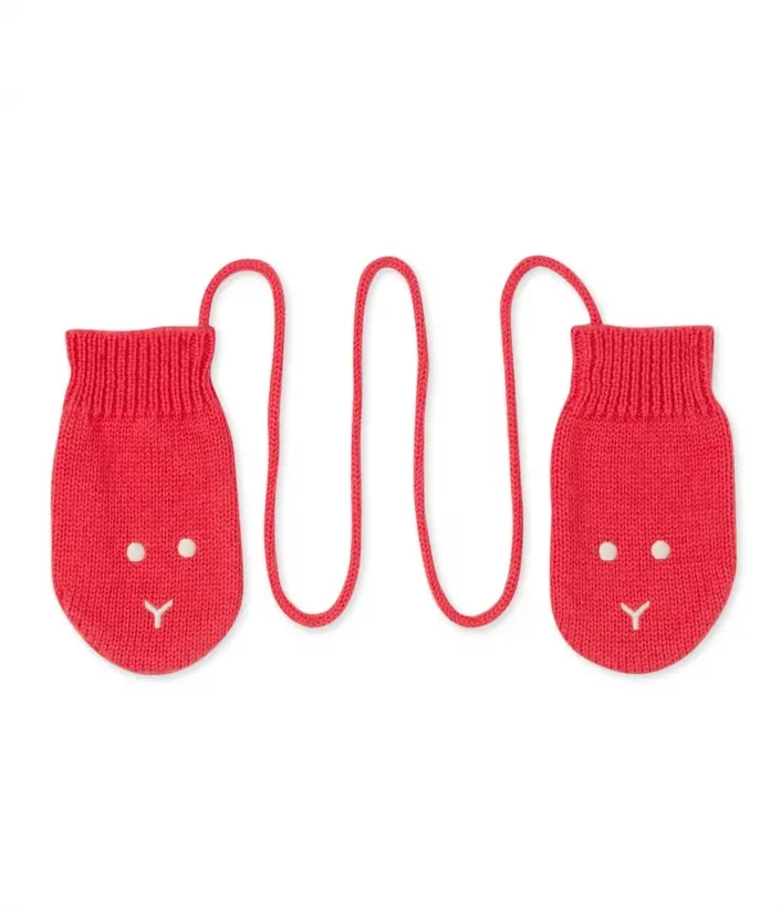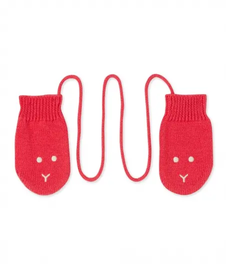 Детские варежки с изображением мордочки медвежонка. Чтобы варежки не потерялись, они соединены шнурком. Материал: 57% шерсть, 43% хлопок.