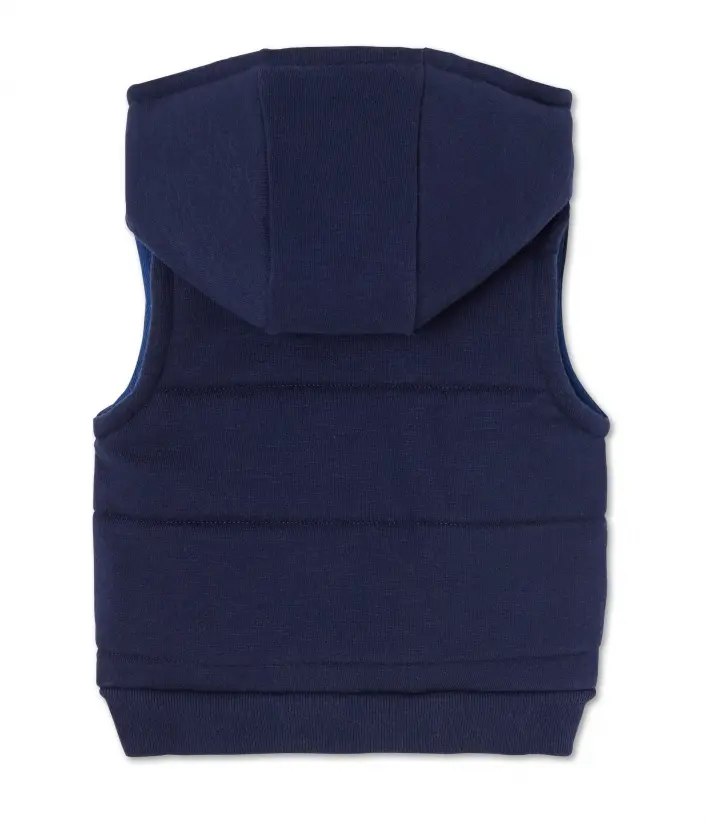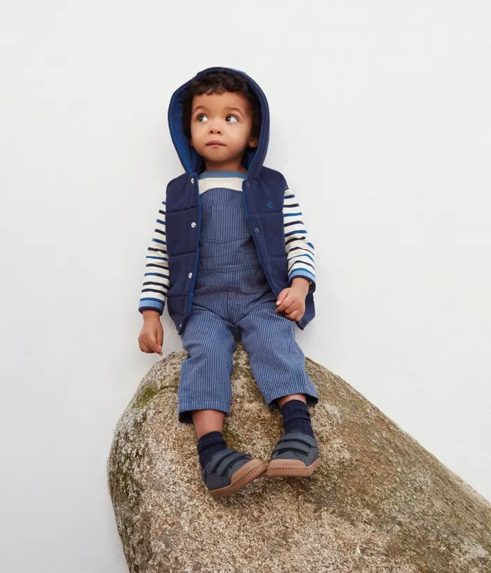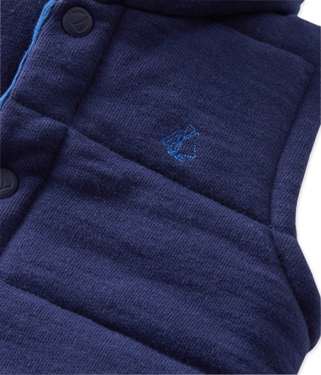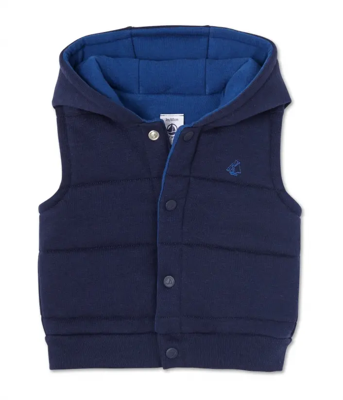 Жилет с капюшоном для мальчика. Жилет изготовлен из ткани в мелкий рубчик, имеет застежку на кнопки с изображением логотипа Petit Bateau. Этот жилет - незаменимая вещь в гардеробе мальчика. Материал: 100% хлопок; подкладка: 100% полиэстер.