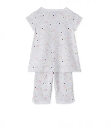Неотразимая пижама для девочки с нежным цветочным принтом. Бриджи имеют длину чуть ниже колена. Футболка имеет квадратный вырез с отделкой в стиле "пико", дополненной небольшим бантиком. Эта слегка винтажная пижама отражает отпечаток сезона, что делает ее идеальной для лета. Состав: 100% хлопок.
