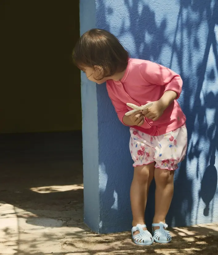 Летний кардиган с круглым вырезом и застежкой на кнопки для девочки. Изготовлен из мягкой хлопковой однотонной ткани. Изящная декоративная отделка в стиле "кокот" на вырезе и планке с застежкой придают особой нежности этому детскому кардигану. Состав: 100% хлопок.