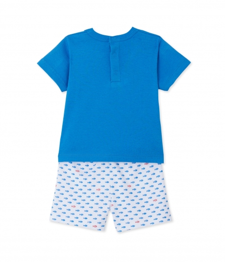 Эта пижама для мальчика состоит из однотонного верха с короткими рукавами и шортиков с принтом в виде рыбок. Футболка украшена изображением рыбок и имеет застежку на спинке. Шорты имеют эластичный пояс, а система застежек соединяет футболку и шортики, чтобы во время сна пижама не задиралась и ребенок оставался в тепле. Эта очаровательная пижама для маленьких мальчиков идеально подходит для лета и может использоваться как одежда для пляжа. Состав: 100% хлопок.