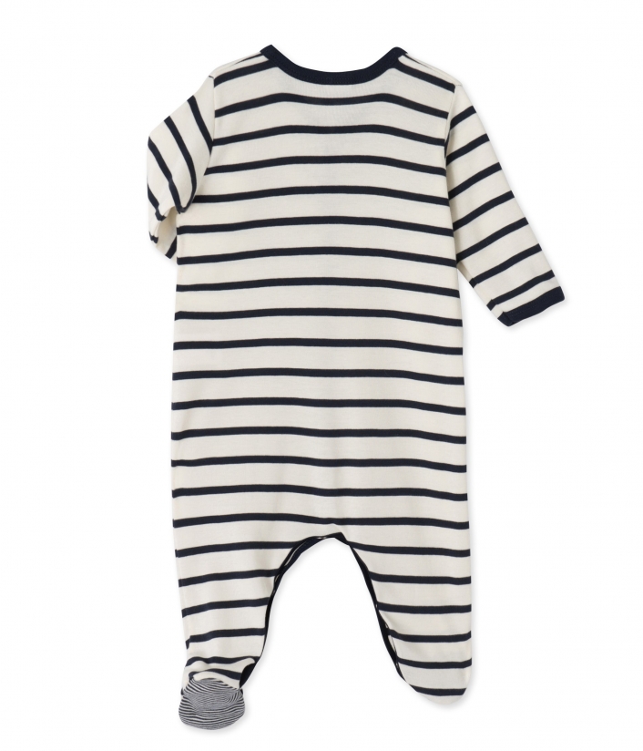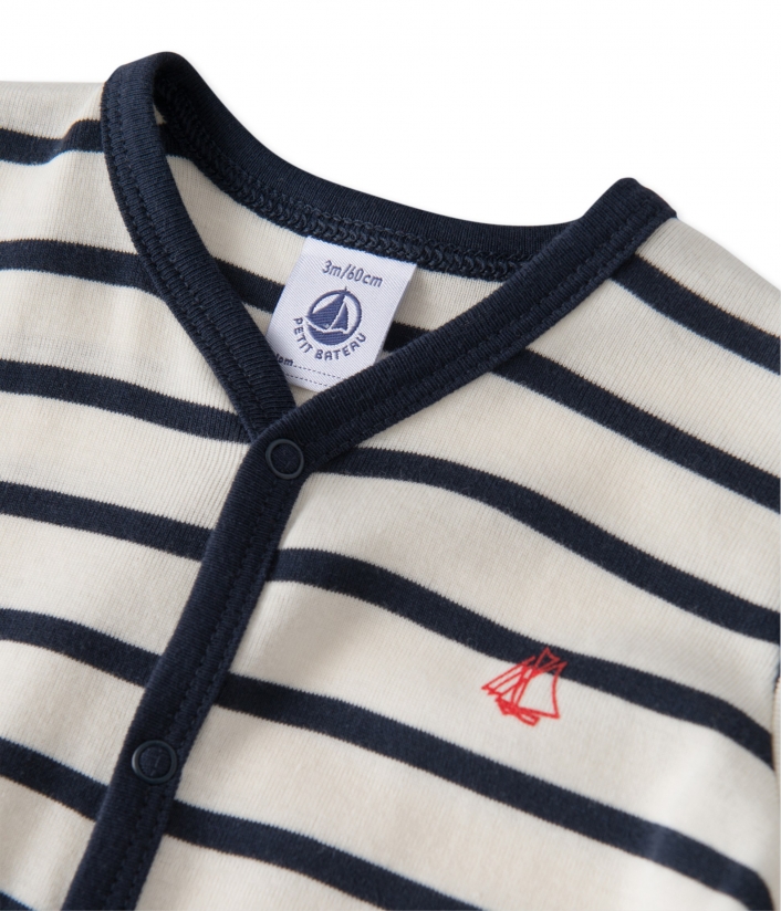 Этот детский уютный комбинезон для сна изготовлен из хлопкового трикотажа с принтом из знаковых морских полос Petit Bateau. Обратите внимание на контрастные подошвы в мелкую полоску. Детская пижама имеет Y-образную систему застежек и она так же красива, как и практична! Неотъемлемая часть гардероба маленькой девочки! Состав: 100% хлопок.