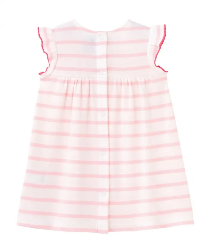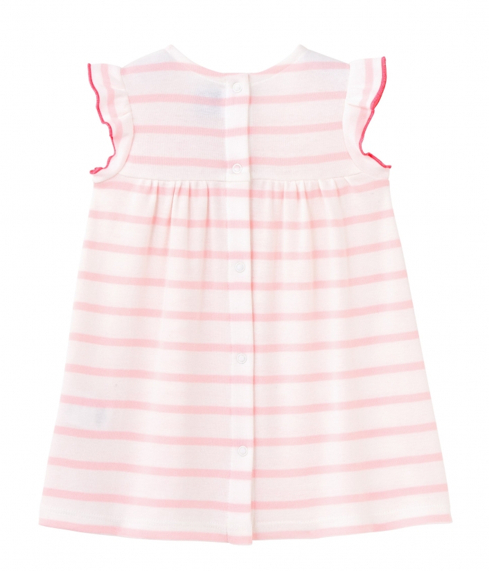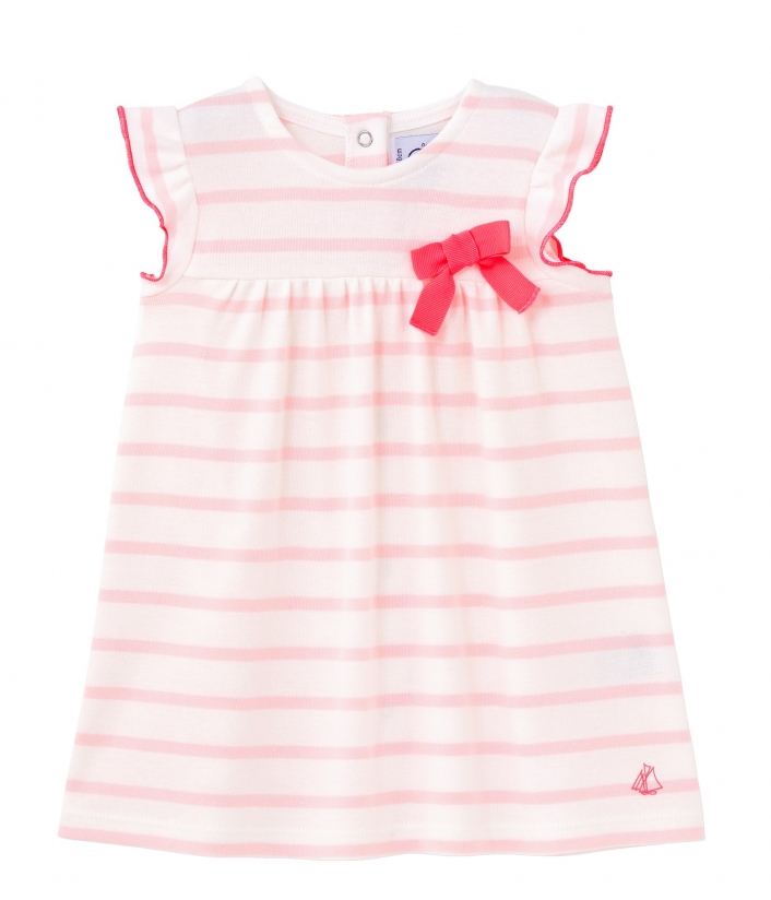 Платье в полоску, на кокетке. Платье украшают короткие рукава-крылышки и яркий бант на груди. Платье имеет застежку на кнопки вдоль спинки. Состав: 100% хлопок.