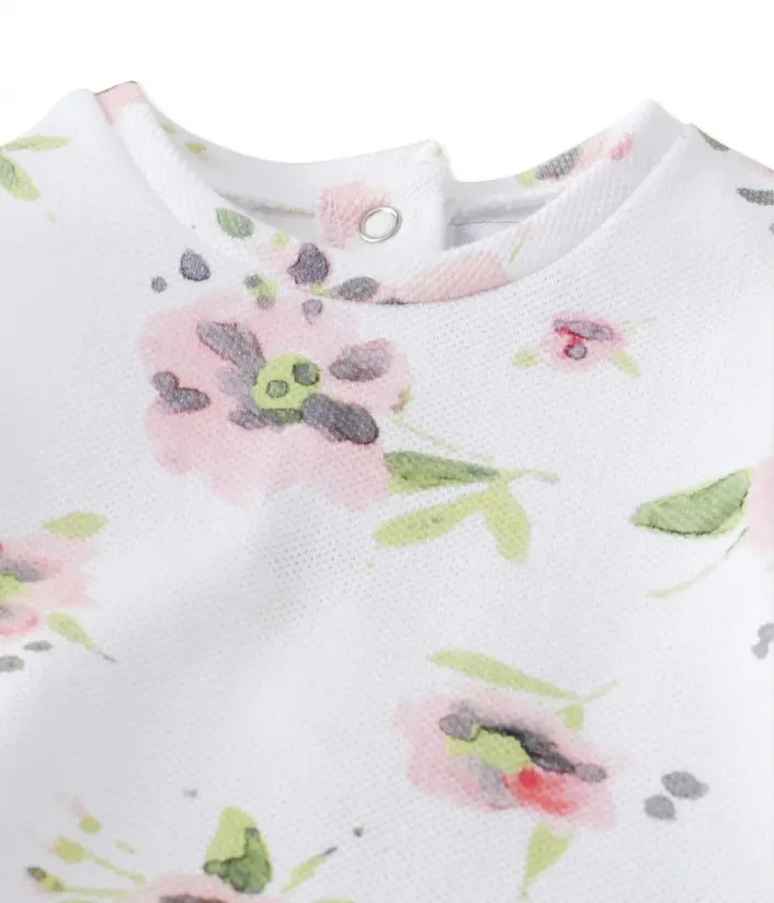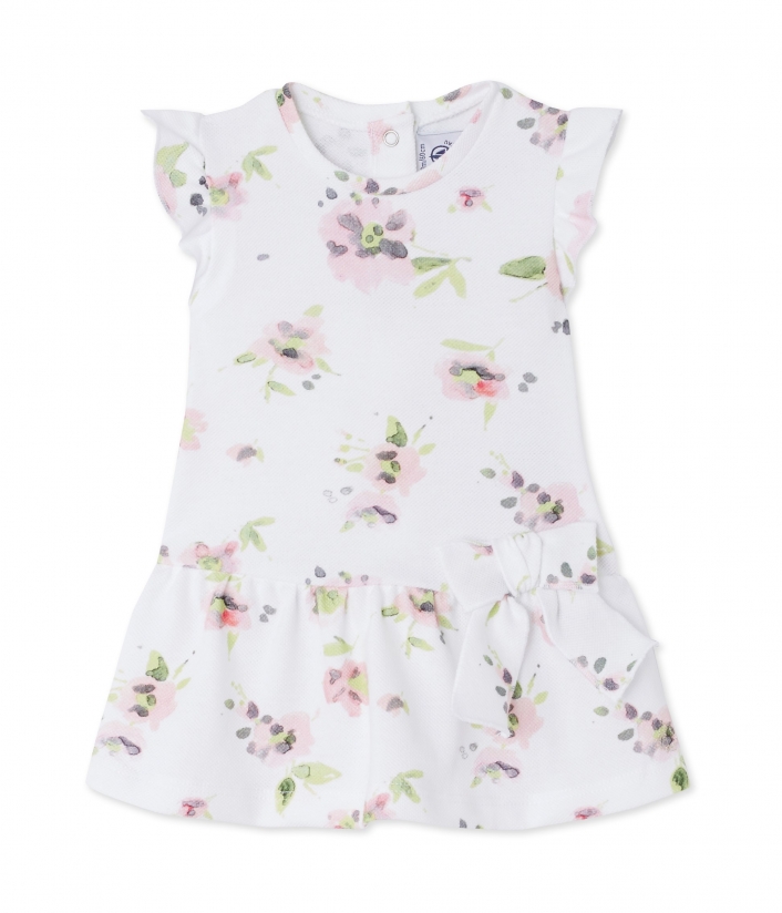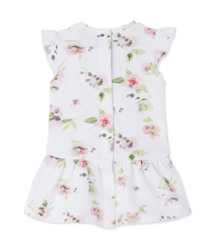 Платье с цветочным орнаментом, с заниженной талией. Платье украшают короткие рукава-крылышки и бант на юбке. Платье имеет застежку на кнопки вдоль спинки. Состав: 100% хлопок.