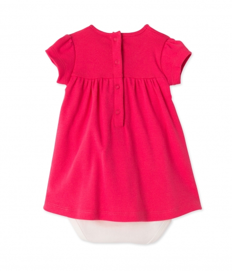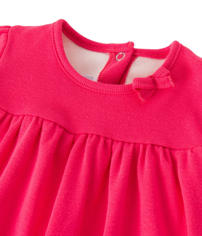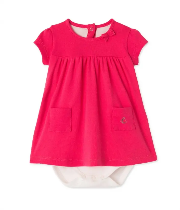 Платье-боди с короткими рукавами для девочки. Изготовлено из традиционной вязаной ткани Petit Bateau. Платье-боди декорировано сборками на груди, симпатичным бантиком на шее и двумя накладными карманами спереди. Обратите внимание на удобные застежки на спинке и между ножками. Очень практичный наряд для лета для Вашей малышки. Состав: 100% хлопок.